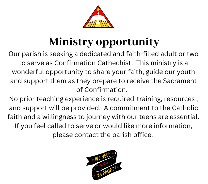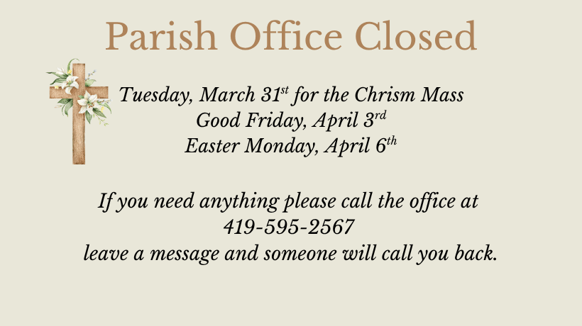 If you are in need of pastoral care from Fr. Tim or want to recieve Holy Communion from one of our Extraordinary Ministers of Holy Communion, please call the office at (419) 595-2567. Messages on Facebook are sometimes missed.