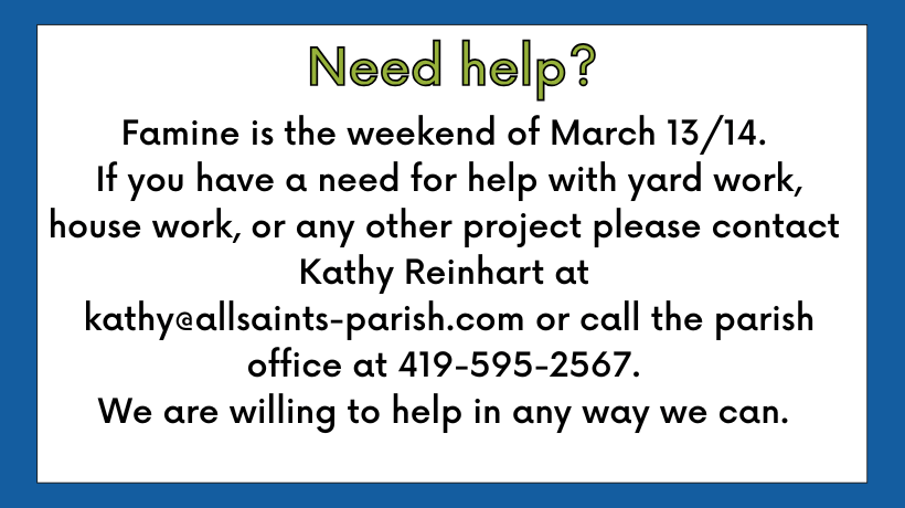 If you are in need of pastoral care from Fr. Tim or want to recieve Holy Communion from one of our Extraordinary Ministers of Holy Communion, please call the office at (419) 595-2567. Messages on Facebook are sometimes missed.